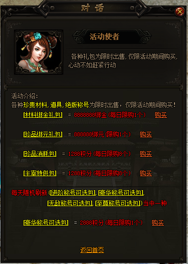 活动期间,活动礼包还同时间全面上架包括全力帮助您游戏更加舒畅开怀。各种珍贵材料,道具,绝版称号为限时出售,珍稀材料随手得,仅限活动期间购买,一定不要错过哦!