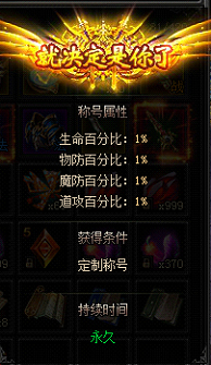 二、玩家累计充值(活动2天累计)达到30000RMB,可以自己选四至六个字-带特效定制称号,全属性增加2%。(定制称号在活动结束后统一提交制作,延后发放;活动期间,每个玩家仅能定制一个2%称号)